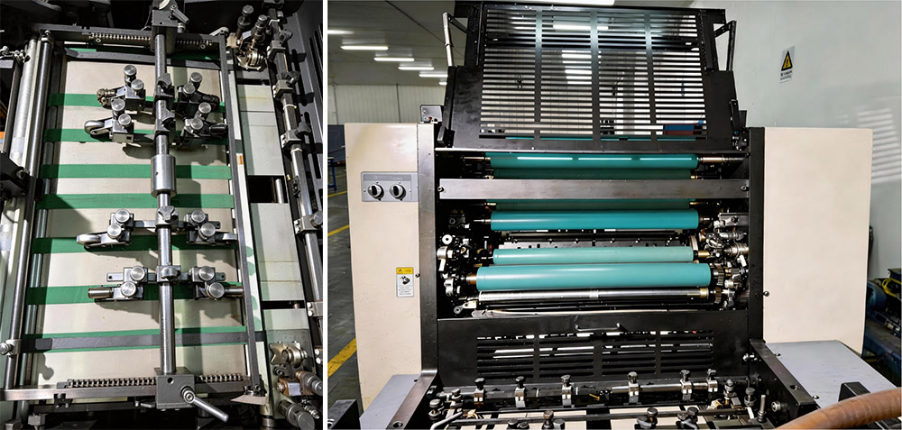 6) Қағаз беру басы, қағаз үстелі, алдыңғы бағыттағыш және қағаз ұстағыштар сияқты қағазды тасымалдау механизмдері баспаның қалың қағаздан жұқа қағазға дейінгі кең ауқымды қағазға басып шығаруын қамтамасыз етеді.