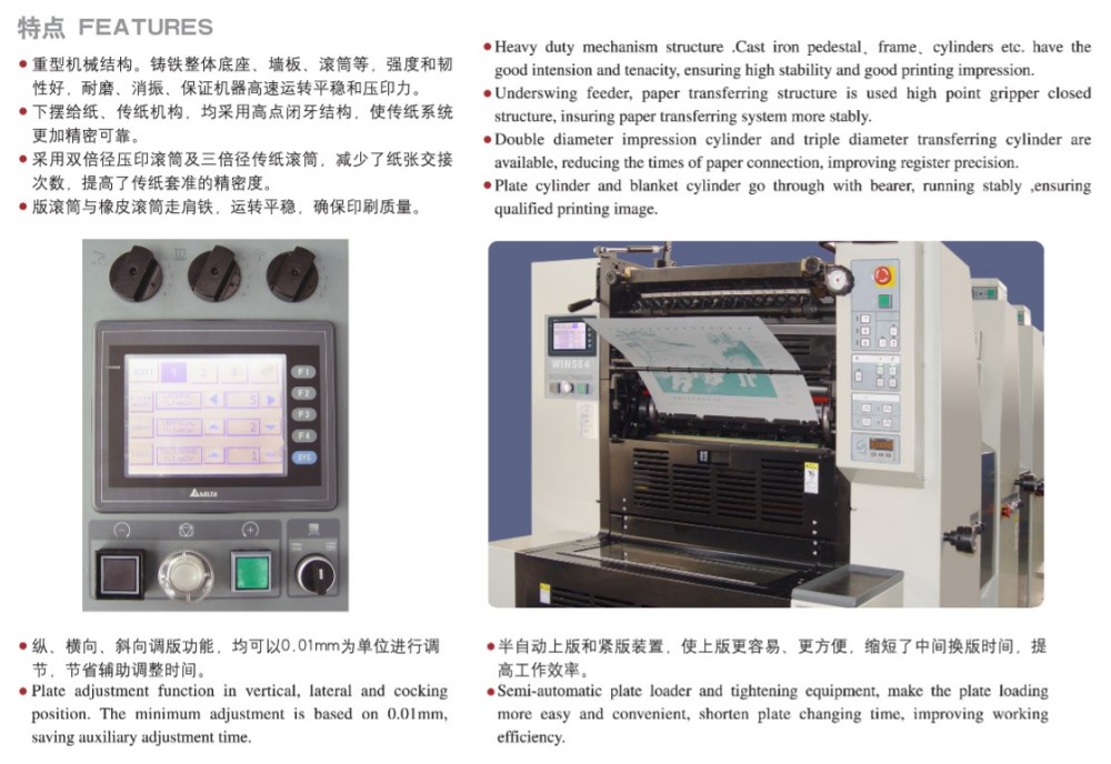Үлкен A3 төрт түсті жапсырма басып шығару офсетті баспа машинасы өнімділігі жоғары модульдермен жасалған және олардың барлығы жоғары сапалы — жоғары дәлдіктегі роликтер мен тісті дөңгелектер, күшті қағаз беру механизмі, жоғары дәлдіктегі қағазды тіркеу жүйесі және тұрақты сиямен қамтамасыз ету жүйесі. Ол жоғары сапалы, тиімді және қол жетімді кесілген түсті басып шығаруға арналған нарықтың талаптарын қанағаттандыруға бейімделген. Бір ғана қағаз қалыңдығын ұстанудың қажеті жоқ — ол қалың картонға дейін (0,4 мм) жұқа қағазмен (0,04 мм) жұмыс істейді. Сондай-ақ интуитивті бағдарламалау интерфейсі бар сенсорлық экран басқаруы бар, ол параметрлерді және басып шығару параметрлерін ақылды, қарапайым түрде реттеуге мүмкіндік береді.