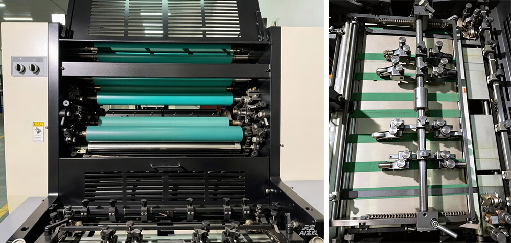 Үлкен A3 қалың қағазды бір түсті парақпен берілетін офсетті баспа машинасы сенімді және тиімді ететін жоғары деңгейлі мүмкіндіктерімен ерекшеленеді. Оның ауыр механикалық құрылымы бар - шойыннан жасалған интегралды негіз, бүйірлік тақталар және роликтер - сондықтан ол берік, қатты, тозуға төзімді және соққыға төзімді. Бұл оның басып шығару қысымын әр уақытта біркелкі сақтай отырып, тіпті жоғары жылдамдықта да біркелкі жұмыс істейтінін білдіреді. Хромдалған баспа цилиндрлері тозуға жақсы қарсы тұрады, бұл машинаның ұзақ қызмет етуіне және күнделікті техникалық қызмет көрсету шығындарын азайтуға көмектеседі. Жоғары дәлдіктегі мойынтіректер мен жерге тұйықталған бұрандалы берілістер қуатты беруді тұрақты және тегіс етеді, дірілдер мен ақаулар болмайды. Қауіпсіздік те басымдық болып табылады — қауіпсіздік құрылғылары операторлар мен машинаның қауіпсіздігін қамтамасыз ету үшін пластиналарды орнатуға, тазалауға, қорғаныс қақпақтарына және есікті реттеуге салынған. Ілініс пен сия роликтеріне арналған пневматикалық басқару жұмысты сенімдірек етеді, күтпеген мәселелер болмайды. Пластинаны орнату механизмі орнату уақытын үнемдей отырып, жылдам орналастыруға және тартуға ие. Оның қағазды тасымалдау бөліктері — беру басы, қағаз үстелі, алдыңғы бағыттағыш және қысқыштар — қалыңнан жіңішкеге дейінгі барлық қағаз түрлерін өңдейді. Айналмалы қолды қағаз беру құрылғысы жоғары жылдамдықты жүгіру кезінде заттарды тегіс сақтайды, ал тіреуіш сақиналары бар пластина мен көрпе цилиндрлері жылдамдықпен жоғары сапалы басып шығаруды қамтамасыз етеді. Қос серіппелі ұстағыштар қағазды қатты ұстайды, тіпті ұзақ басып шығару жұмыстары кезінде де сырғып кетпейді. Оған қоса, сия шығыршықтарын тазалаудың жартылай автоматты жүйесін пайдалану оңай — ол тазалау уақытын қысқартады, сия түсінің өзгеруін жылдамдатады, жұмыс жүктемесін жеңілдетеді және өндіріс тиімділігін арттырады. Сондай-ақ оның PLC басқаруы және операторлар үшін қарапайым, қолдануға оңай интерфейсі бар сенсорлық экраны бар.